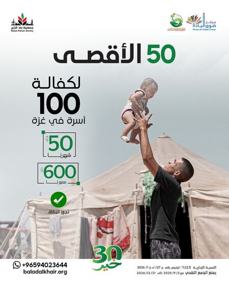 من هنا تطلق جمعية بلد الخير بالتعاون مع فريق الهدى للإغاثة والتنمية ومركز ضوى اليادة مشروع 50 الأقصى لكفالة 100 أسرة متعففة في غزة، عبر توفير دعم شهري يساهم في تأمين الغذاء والدواء والاحتياجات الأساسية، ويحفظ كرامتهم في ظل هذه الظروف الصعبة.