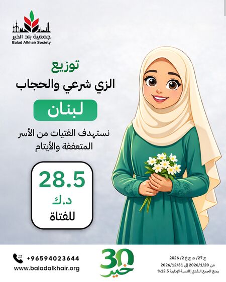 انطلاقًا من مسؤوليتنا الإنسانية، تطلق جمعية بلد الخير مشروع توزيع الحجاب والكسوة للفتيات المحجبات في لبنان، حيث تتكون الكسوة من: